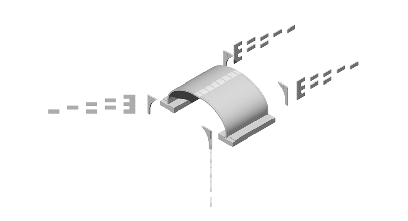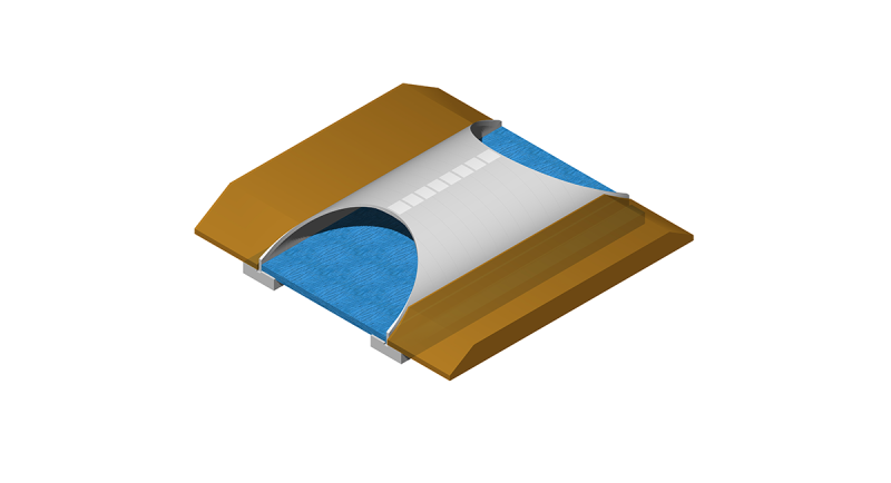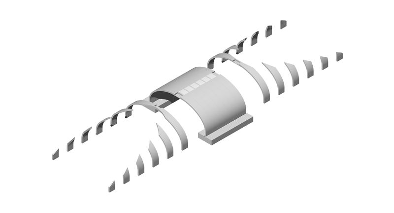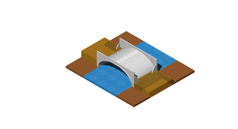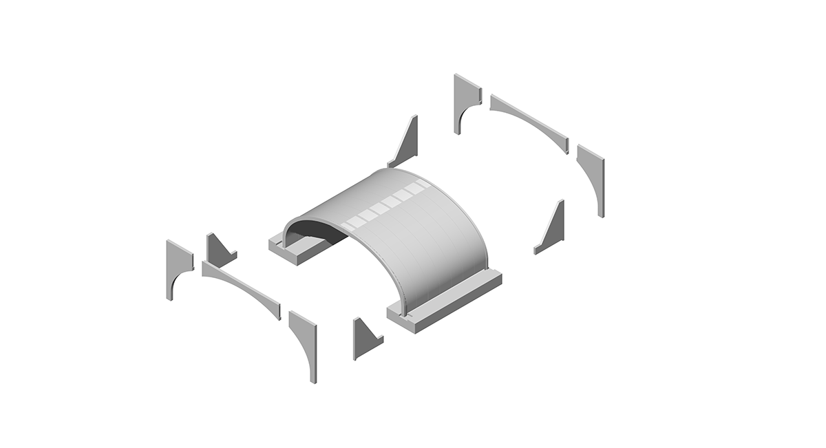 Segmentowa ściana przyczółkowa dla systemu InorArch® składa się z 2 lub 3 segmentów, opartych na końcowym elemencie łuku, który posiada również nawierzchniowy krawężnik zapewniający podparcie poziome.