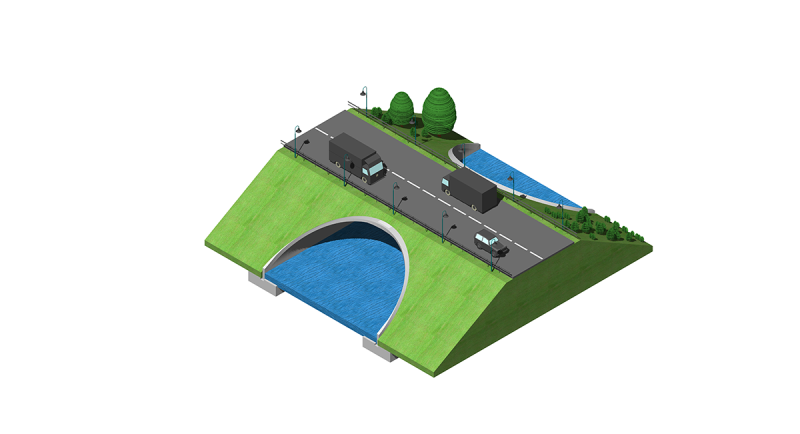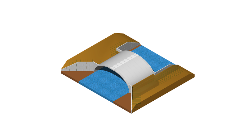 Rozwiązanie opracowane przez InorArch® pozwala kształtować skośne zakończenia łuku poprzez zastosowanie prefabrykowanych elementów łuku przyciętych pod odpowiednim kątem i połączonych monolitycznym złączem pętlowym wykonywanym na budowie.